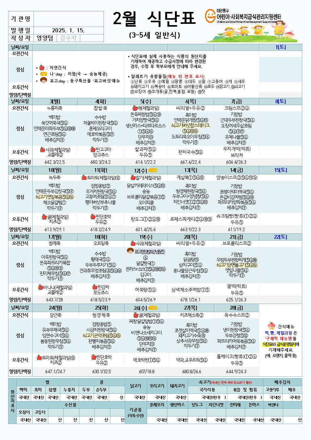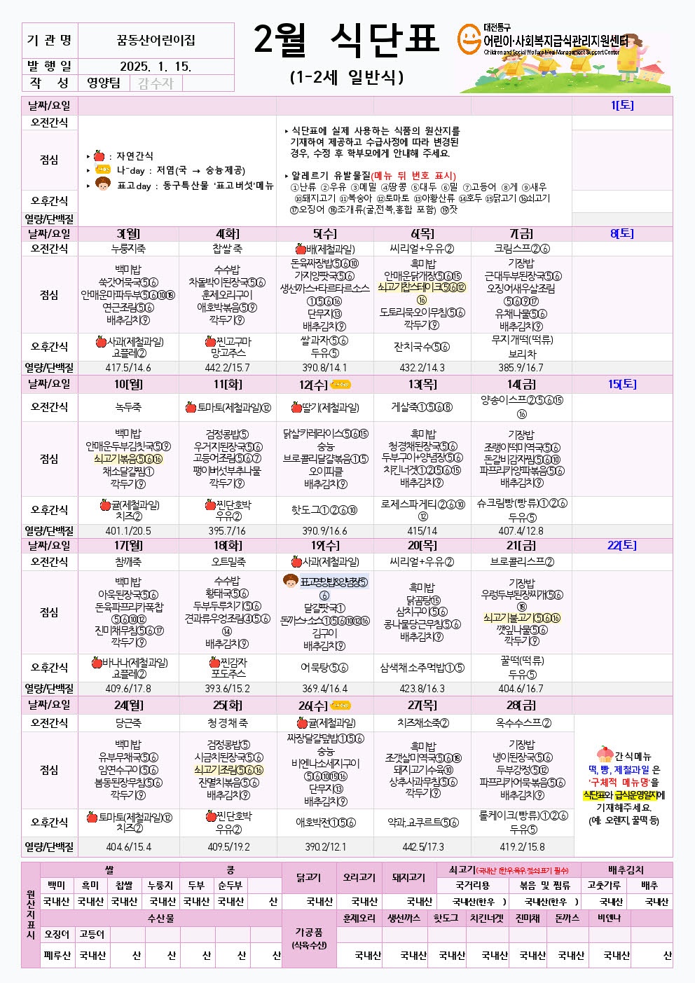 꿈동산어린이집의 월 식단표입니다.