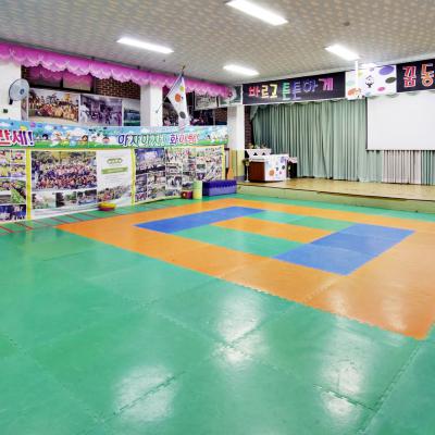 비가 오는 날씨에도 <튼튼하게 생활>할 수 있도록 <넓은 강당>에서 신나게 뛰어놀 수 있습니다.